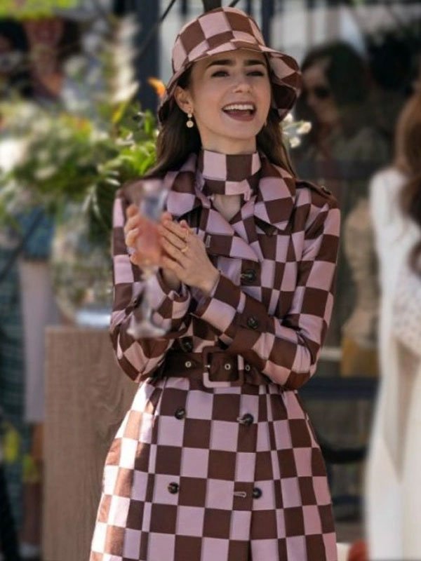 Emily In Paris S04 Lily Collins Checked Pink& Brown Coat