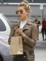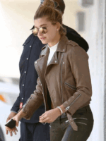 Hailey Bieber Brown Real Leather Biker Jacket
