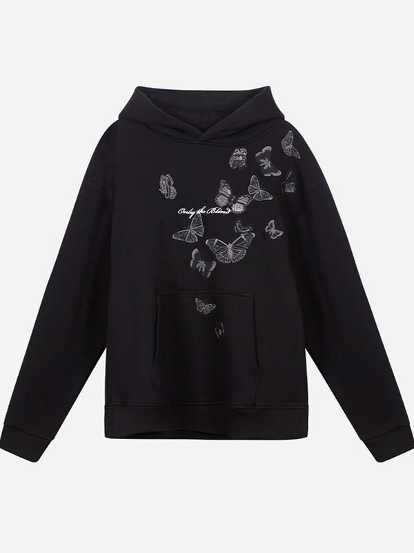 Only For Blind Butterfly Printed Pullover Black Hoodie